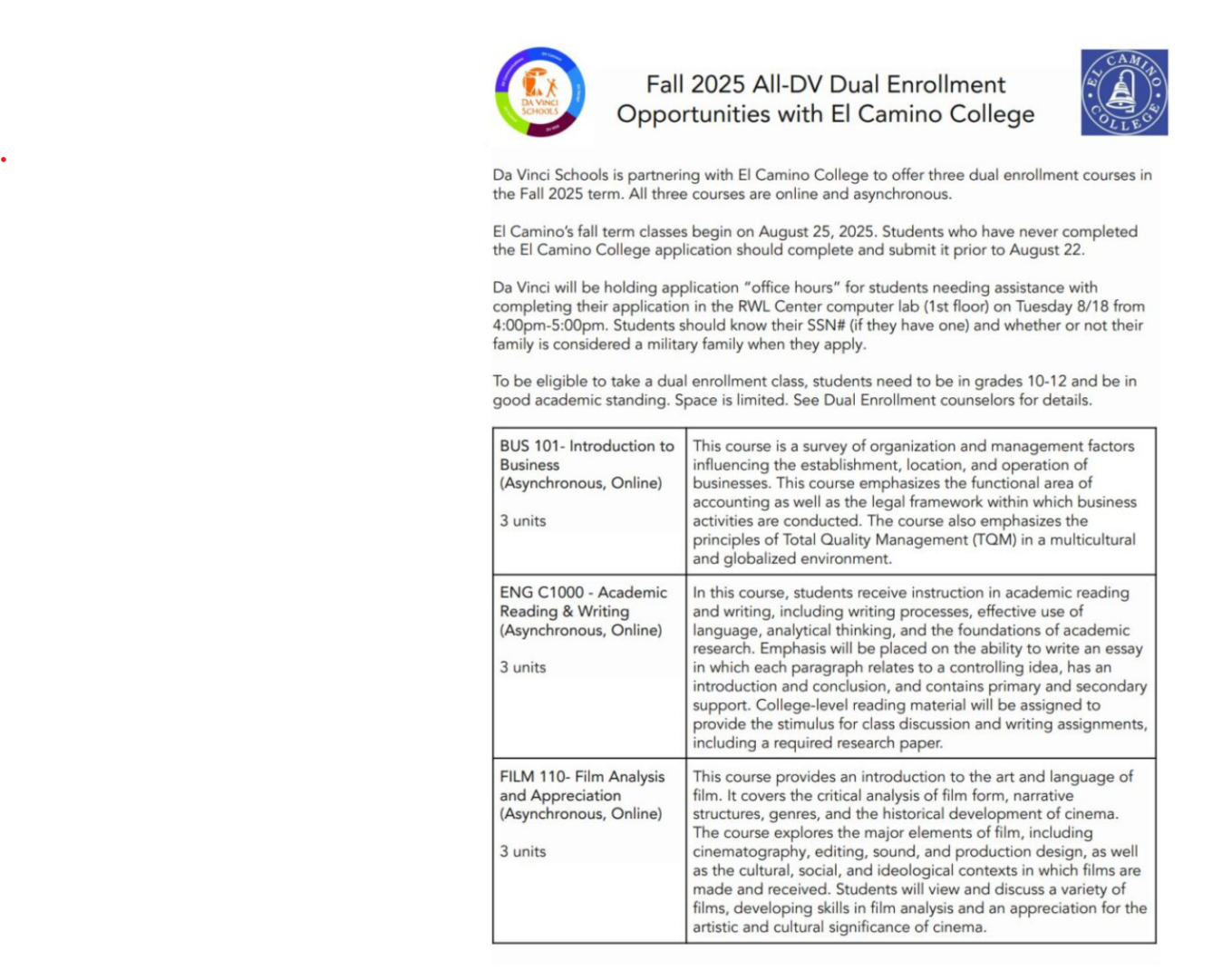 Return to Fall 2025 Dual Enrollment Opportunities (10th-12th Grade) – UPDATE – BUS 101 is no longer offered